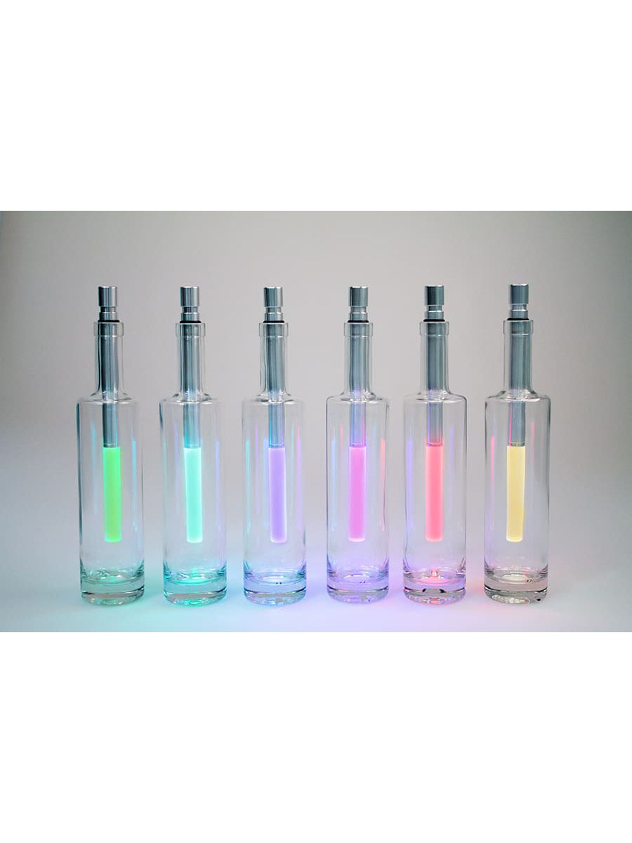 Fits into all wine or other bottles with a standardized bottleneck diameter of 0.67" - 0.87" (17-20 mm). Suitable for indoor and outdoor use. Made of aluminum and acrylic glass. Operated by 3 AA batteries (not included). Bottle not included.