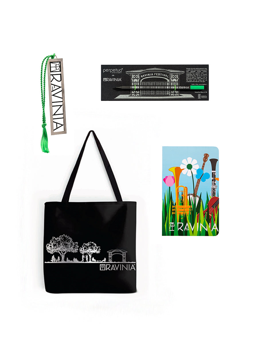 Contains 1 Ravinia Bookmark, 1 Ravinia Perpetua Pencil, 1 Ravinia Journal, and 1 Ravinia Canvas Tote Bag.
