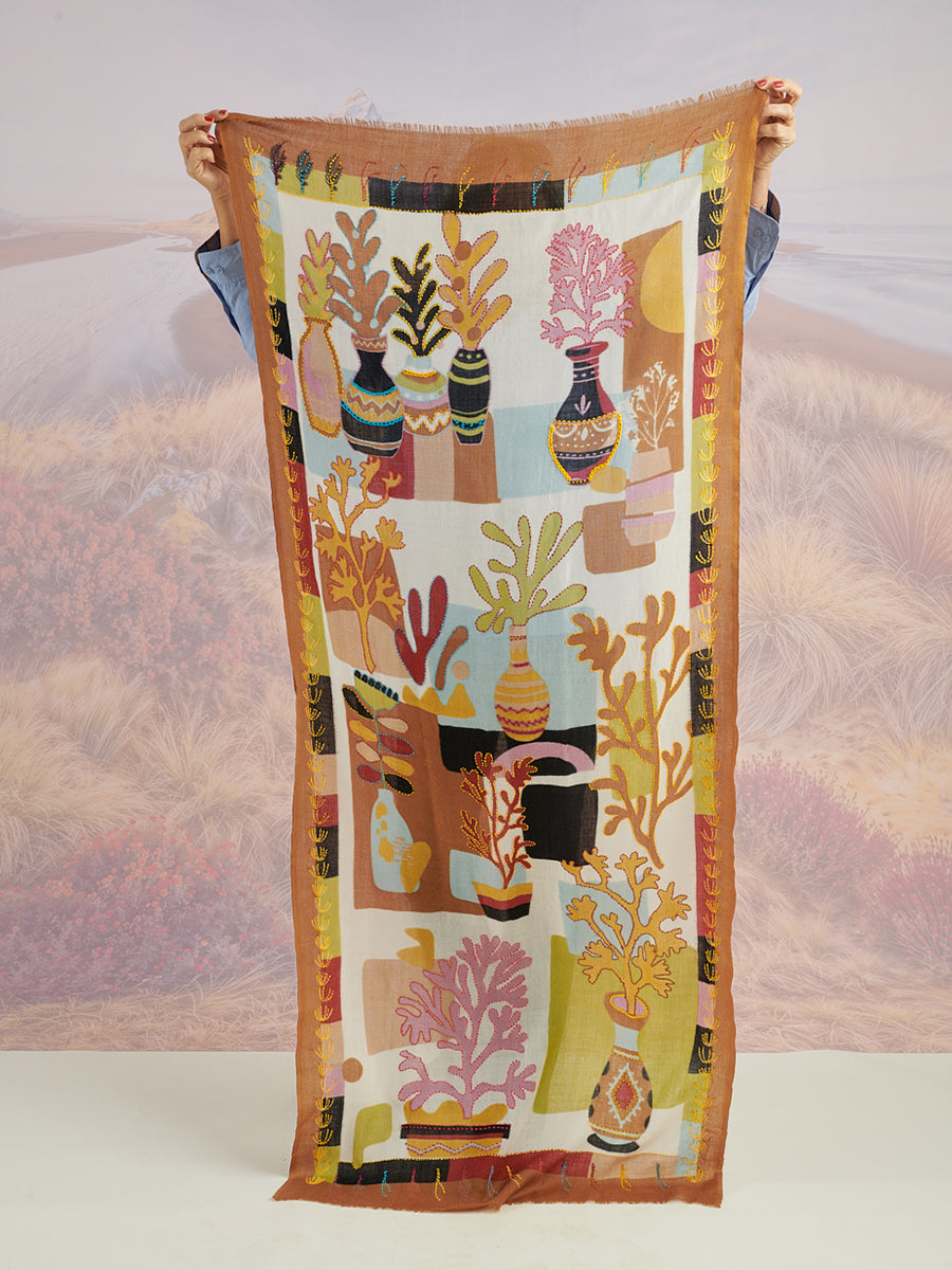 Scarf is made of 100% embroidered matty wool and measures 39.4" x 78.75".