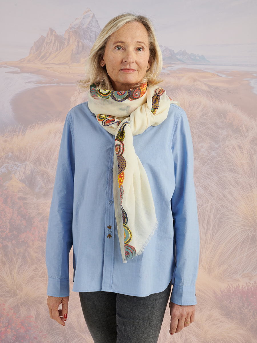 In 2007, she returned to France and joined by her twin sister Françoise Micciche in 2016, launched their brand, combining the use of India's ancestral know-how with their passion for French fashion. Since her journey began, Marie has maintained a special and unique attachment to India. Although the designs of her products are made in Lyon, France, she entrusts her production to historical and artisanal suppliers whom she visits regularly and has worked with for more than 16 years. India, world famous for its weaving techniques, its beautiful materials and embroideries, perfectly matches the style and colors of the designer, and gives character to the products. On site several times a year, Marie sources new materials, trends, ensures quality control of production and respect for environmental and ethical standards.