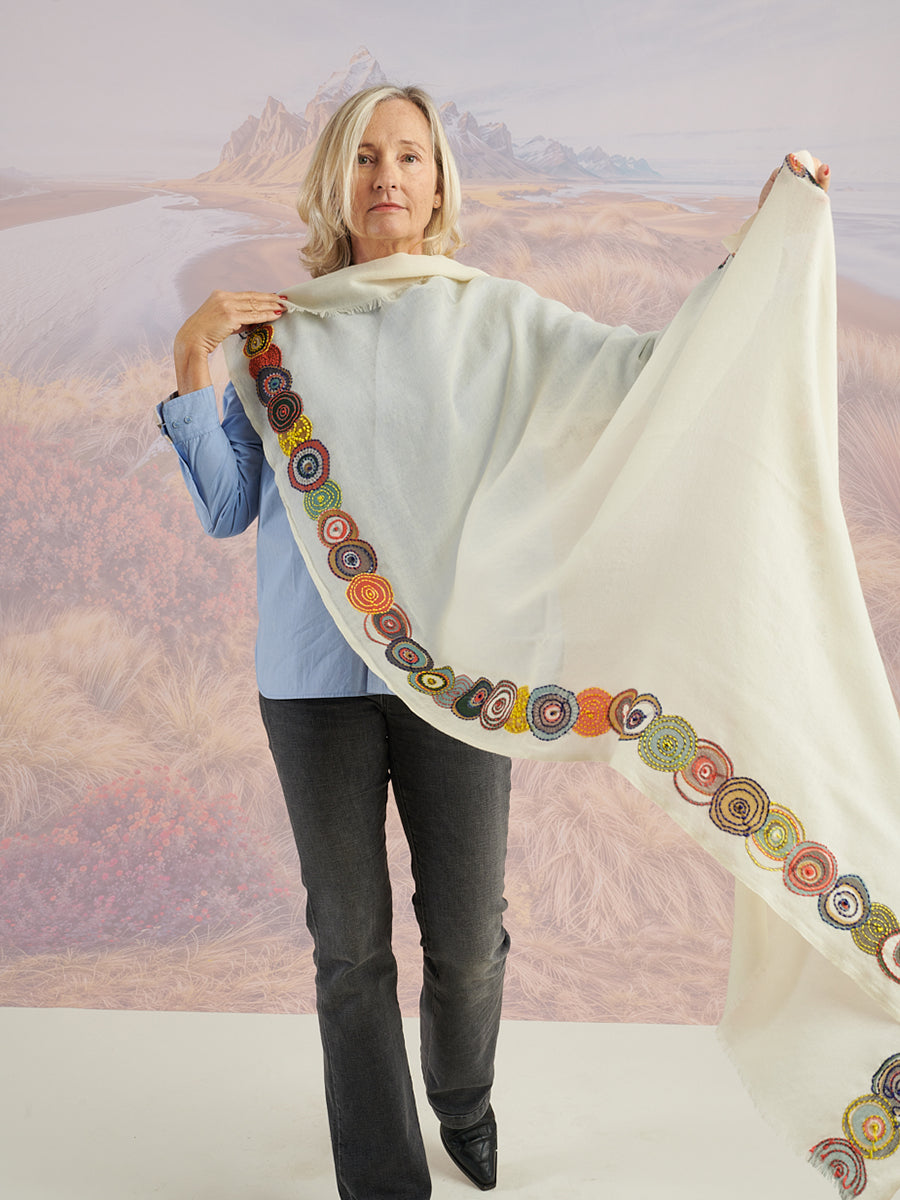 Scarf is made of 100% embroidered matty wool and measures 39.4" x 78.75".
